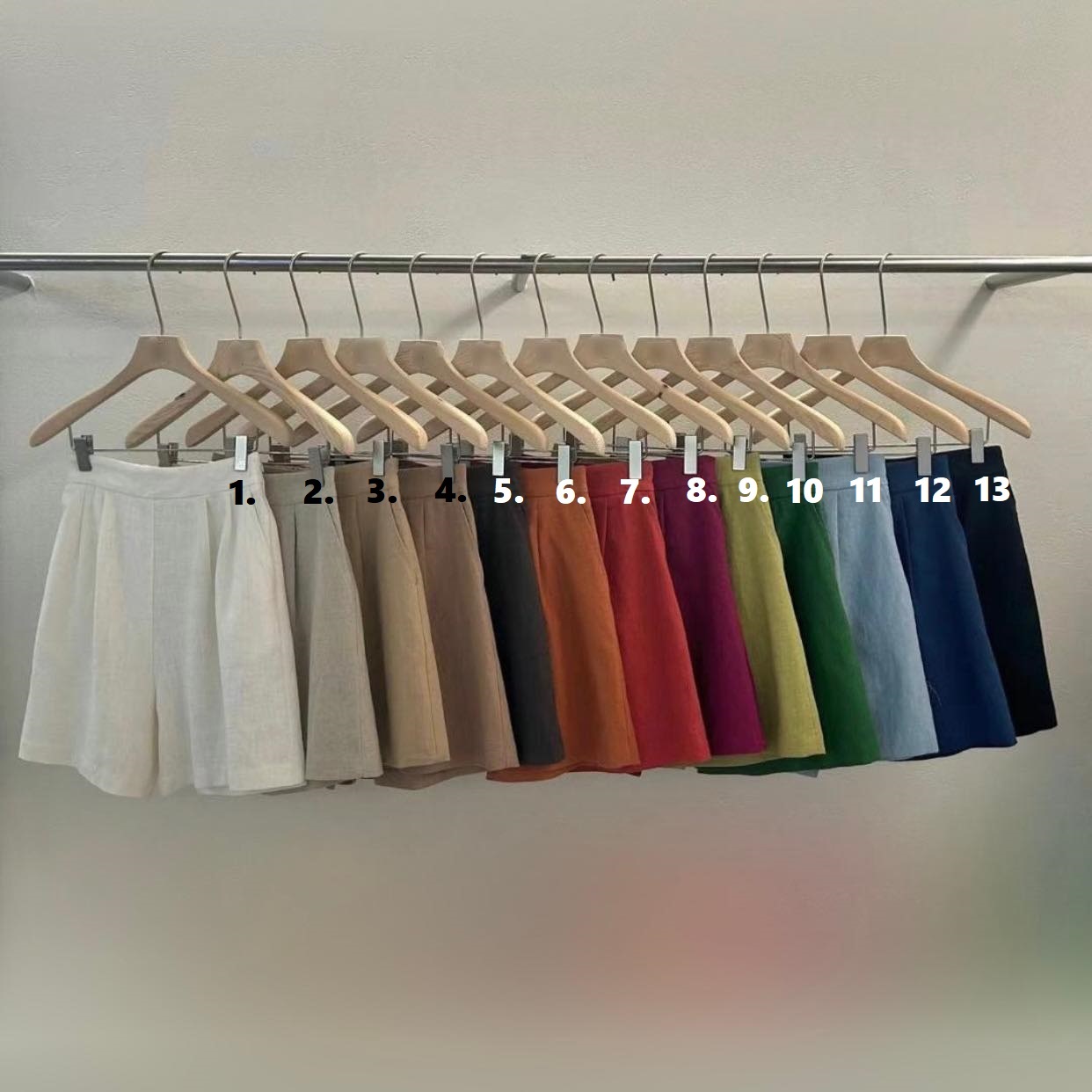 Color: 1.米白、2.淺杏、3.深杏、4.可可、5.深啡、6.橙色、7.玫紅、8.桃紅、9.青綠、10.深綠、11.天藍、12.深藍、13.黑色