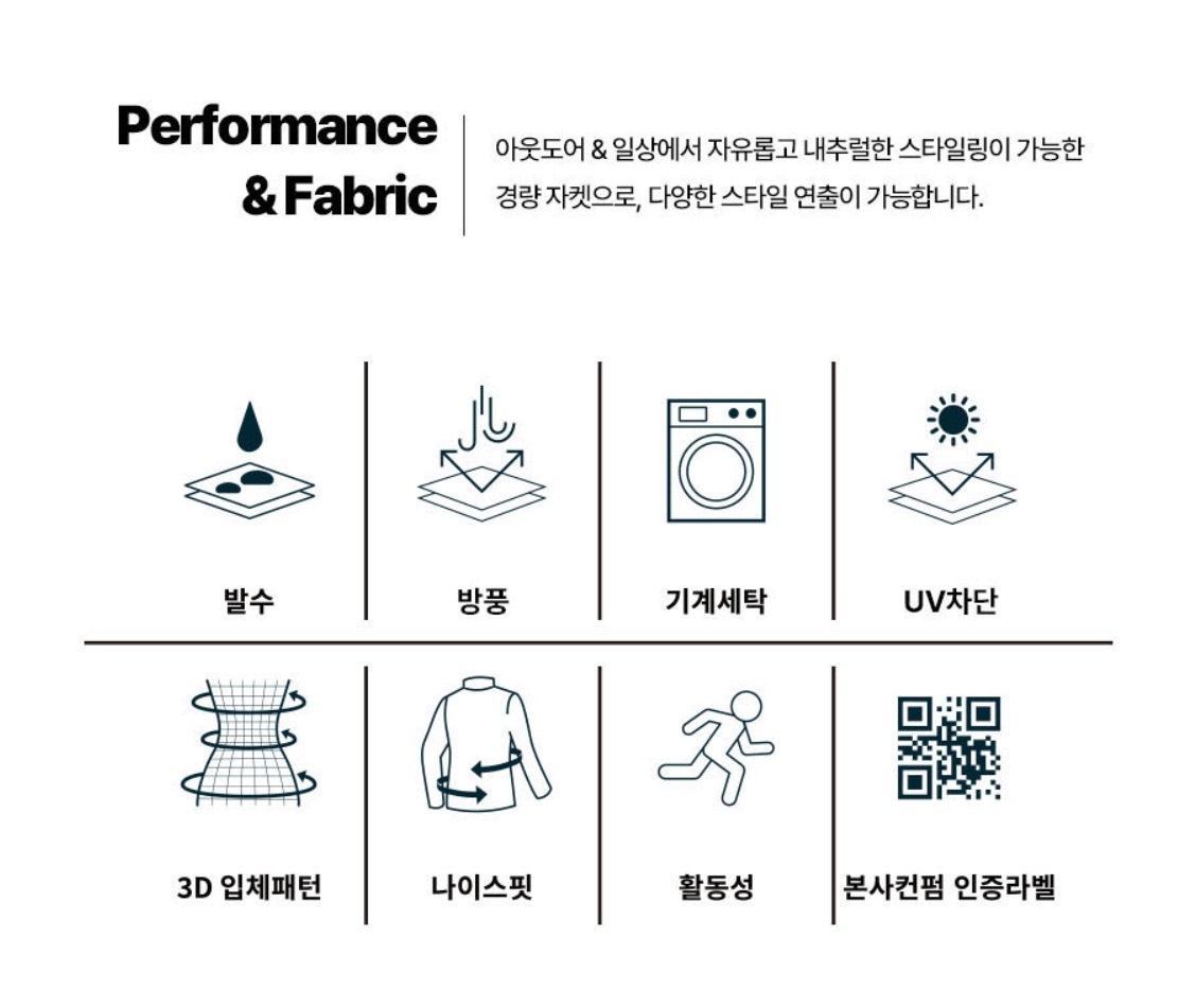 - Performanace, Windproof, Water Repellent, UV Blocking, Ventilation, Cool Touch