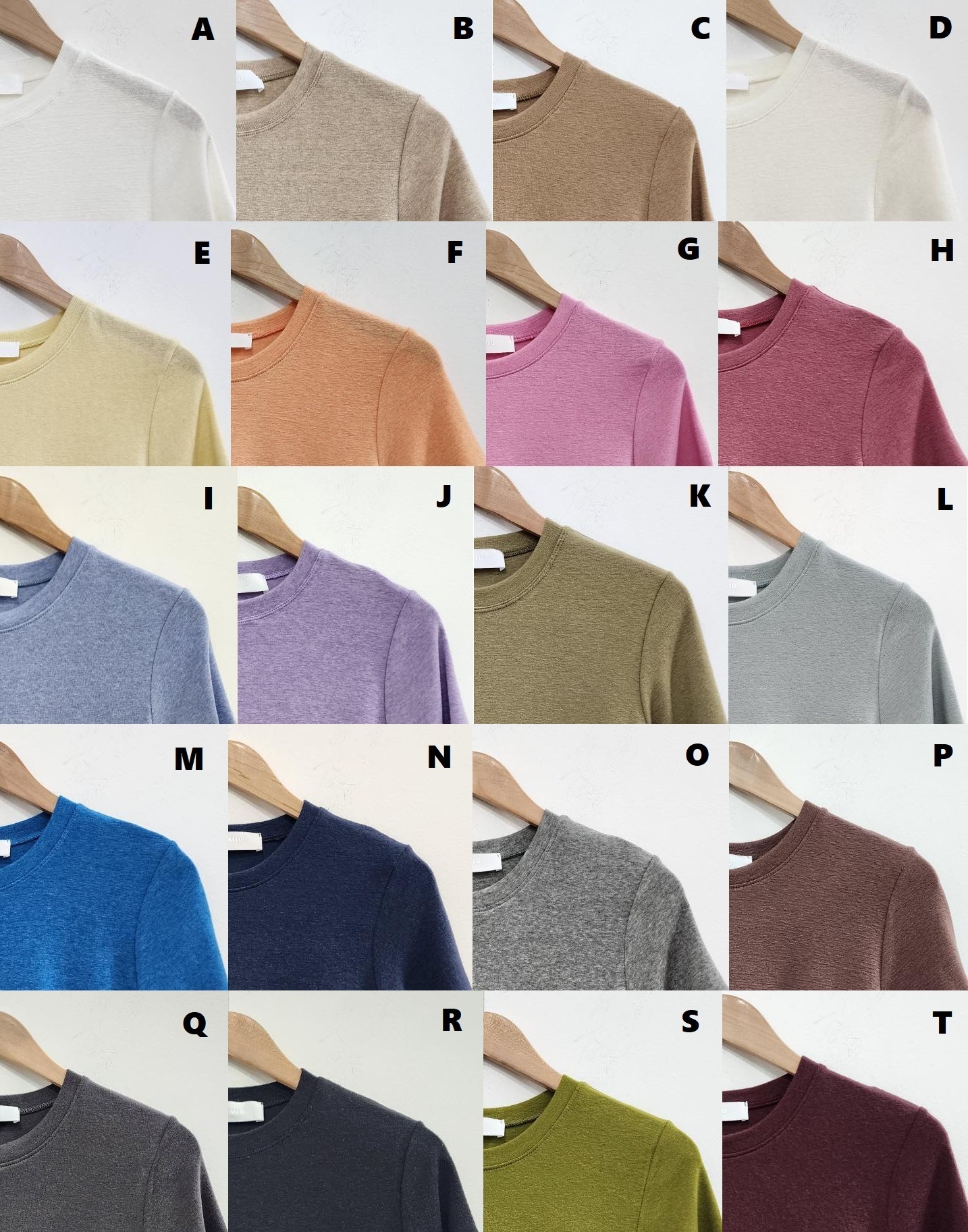 A純白, B燕麥, C深杏, D米白, E黃色, F橙色, G粉紅, H玫瑰, I天藍, J紫色, K卡其綠, L湖綠, M藍綠, N深藍, O中灰, P啡色, Q深灰, R黑色, S草綠, T酒紅